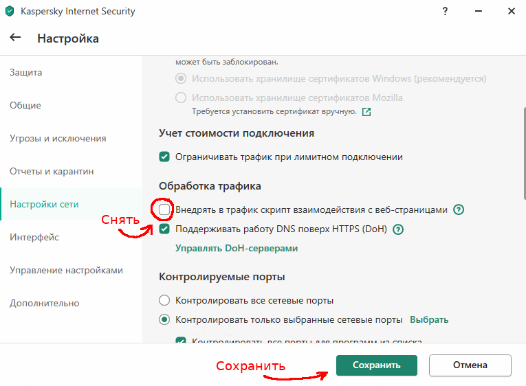 В Касперском надо дополнительно зайти в "Настройки сети" и снять галочку с пункта "Обработка трафика" - "Внедрять в трафик скрипт взаимодействия". (Смотрите снимок экрана, как это сделать)